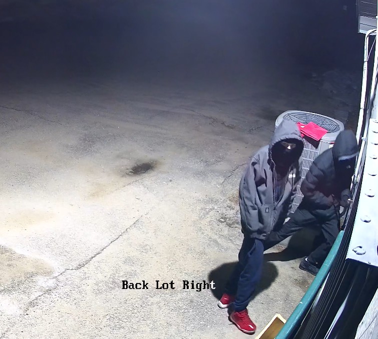 Suspect 2: White slender male with a gray zip-up Alaskan Hardgear jacket with the logo “Spang Builders” embroidered on left chest, blue sweatpants, and red sneakers with white soles.