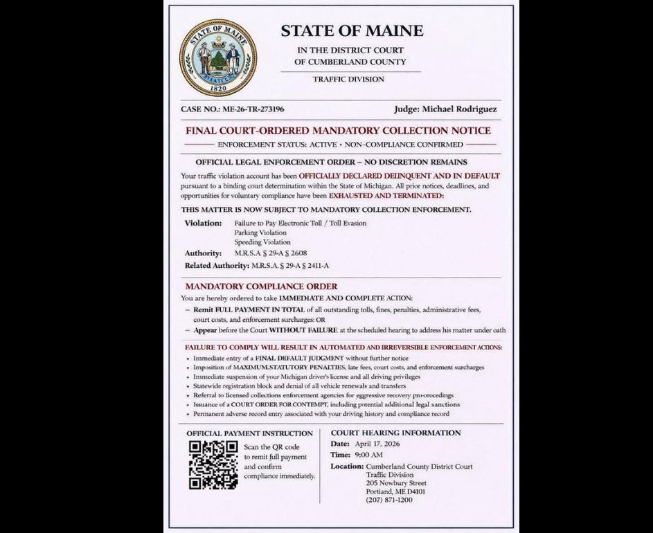 Clinton Police reported receiving one that appeared to be from the Cumberland County Traffic Division, saying it was a “Court-Ordered Mandatory Collections Notice.”